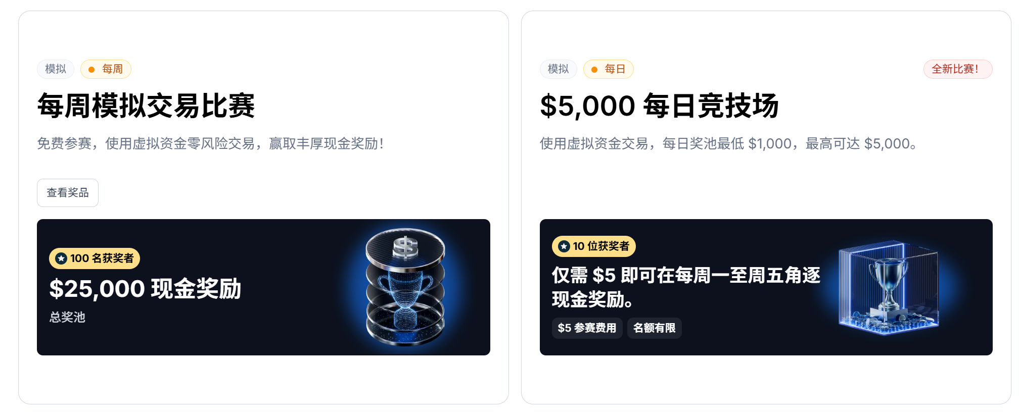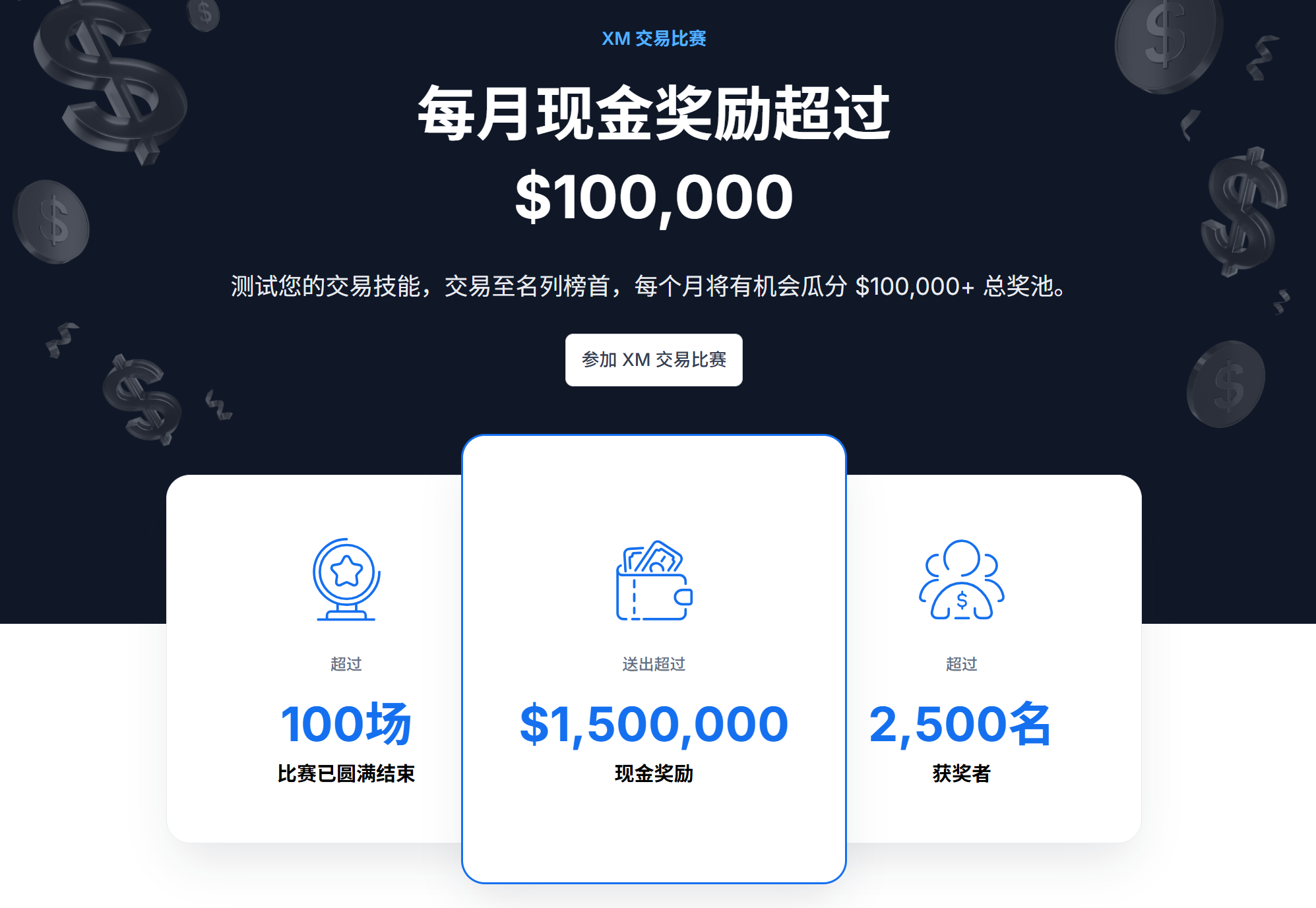 XM 交易比赛送出丰厚现金奖励,包括免费报名的模拟交易比赛,欢迎所有交易员报名参加,只需交易即有机会赢奖金 ,每月现金奖励超过 $100,000 测试您的交易技能,交易至名列榜首,每个月将有机会瓜分 $100,000+ 总奖池。